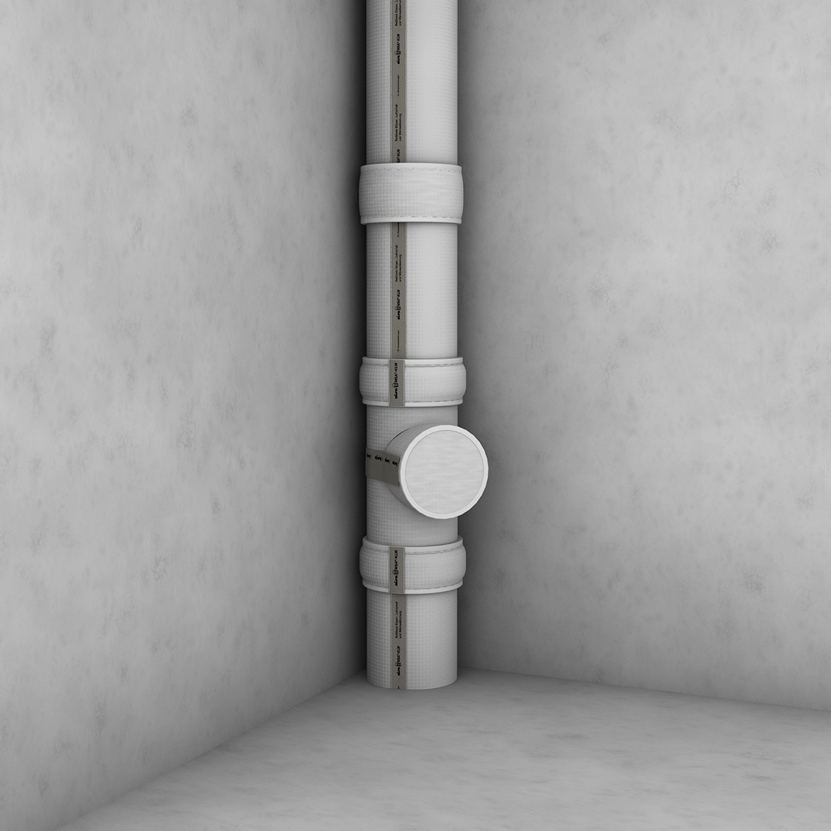 Körperschall-, Luftschall- und Schwitzwasserdämmung von Abwassersystem-Revisionsöffnungen. Insbesondere in freier Verlegung durch akustisch sensible Bereiche