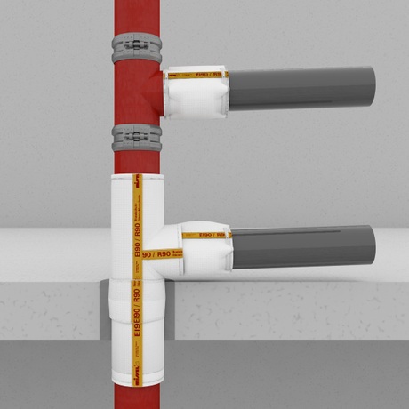 R90 Rohrabschottung für Mischinstallation, körperschallentkoppelt, zur Durchführung von gusseisernen Abwasserleitungen durch Decken mit waagrechtem Übergang auf Kunststoff-Abwasserleitungen